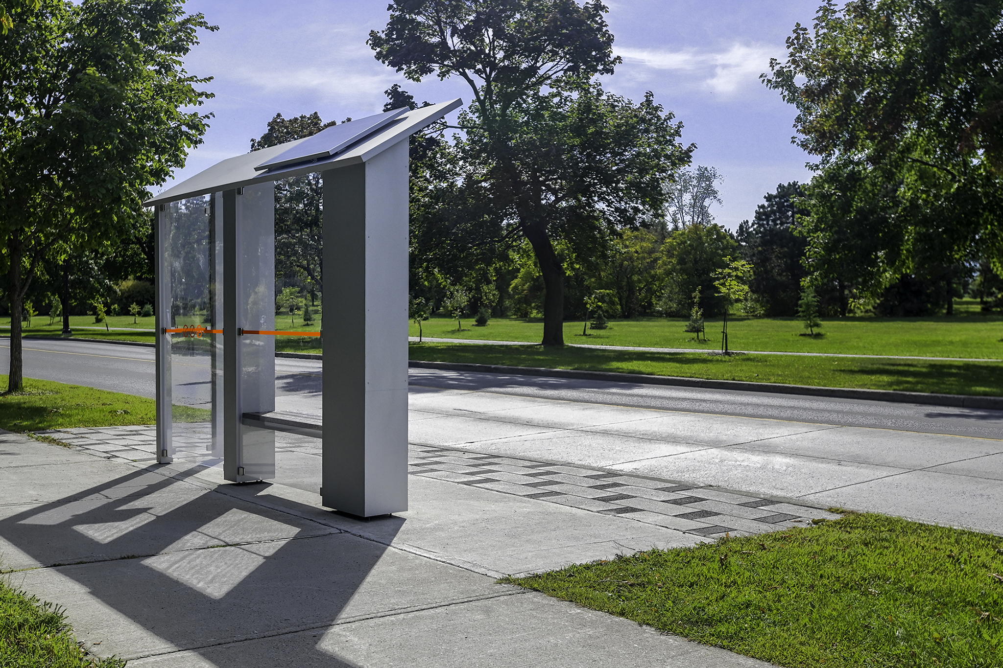 The development of this new marquee-style bus shelter is in response to the Réseau de transport de Longueuil (RTL) wanting to offer a compact and flexible solution, suitable for limited space constraints. The concept had to allow a polished integration of the signage, particularly of the bus numbers and schedules, while allowing the potential addition of solar panels and accented lighting depending on operational needs.